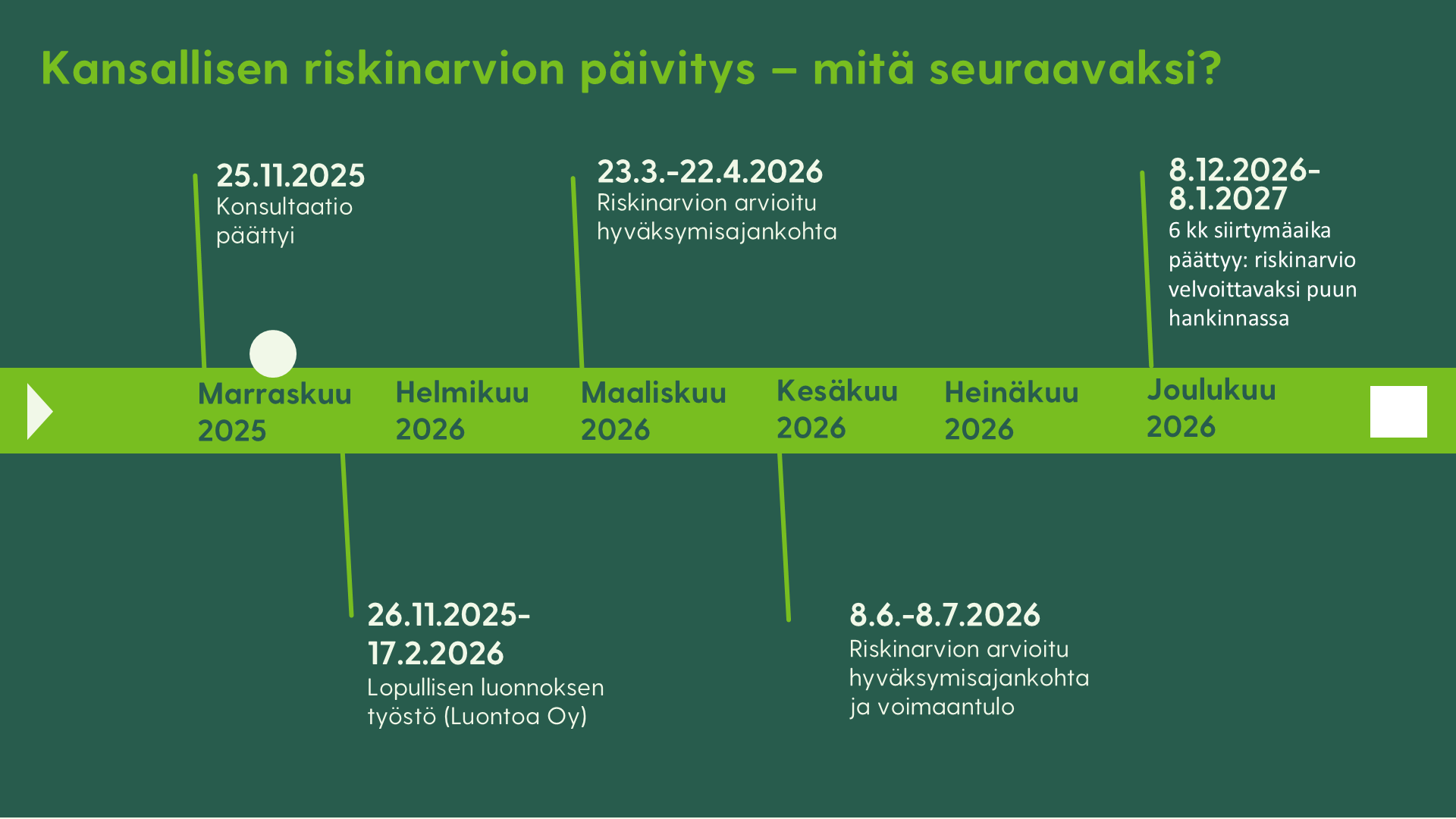 Riskinarvion luonnosta koskeva konsultaatio on päättynyt, ja Luontoa Oy työstää sen pohjalta lopullista luonnosta. Taustalla on laaja aineisto, joka koostuu sekä kirjallisista lähteistä että asiantuntijoiden haastatteluista. Riskinarvion arvioitu hyväksymisajankohta on maalis-huhtikuussa 2026. Voit tutustua prosessin aikatauluun tarkemmin tämän tekstin alta.