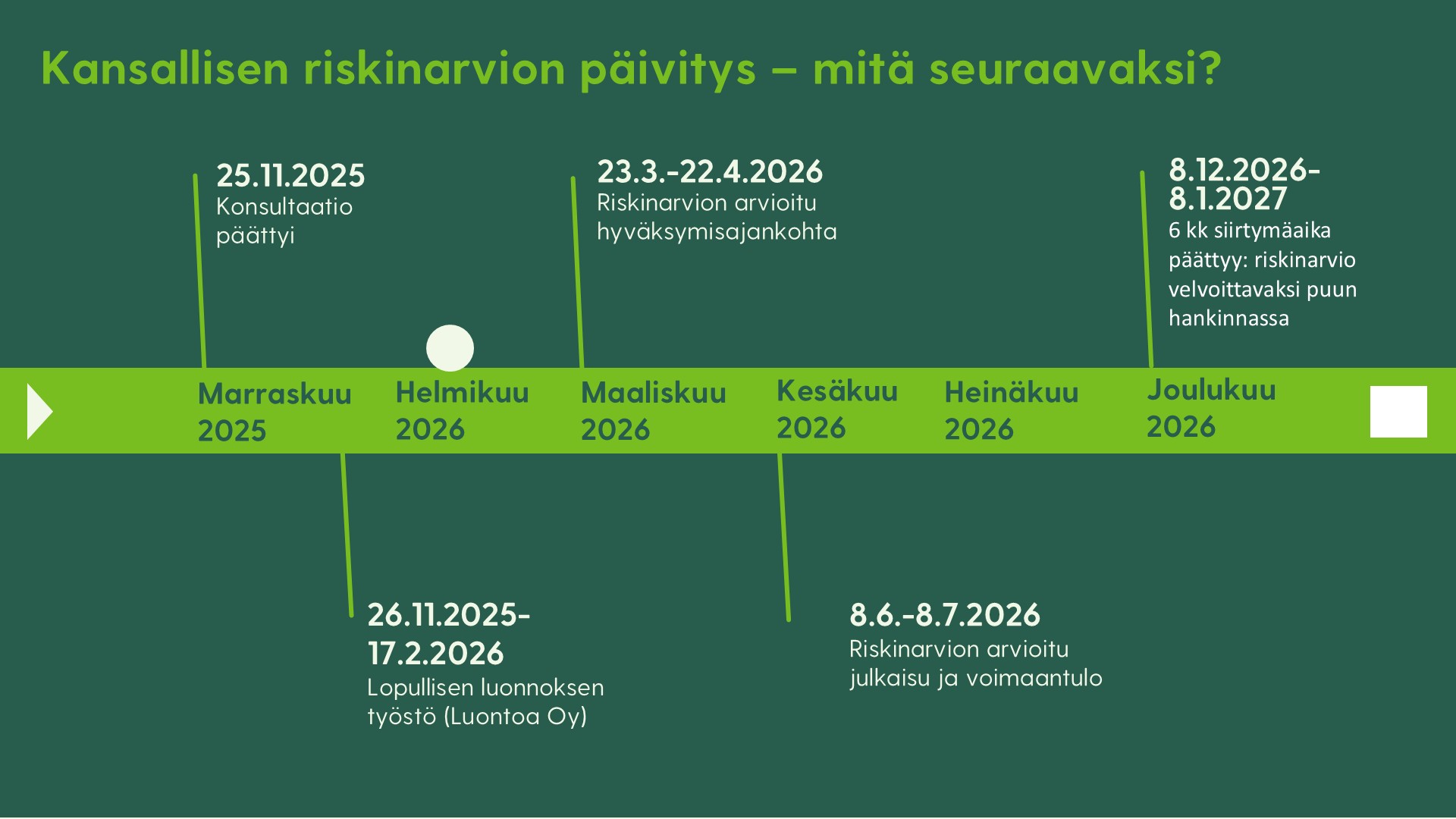 Riskinarvion luonnosta koskeva konsultaatio on päättynyt, ja Luontoa Oy työstää sen pohjalta lopullista luonnosta. Taustalla on laaja aineisto, joka koostuu sekä kirjallisista lähteistä että asiantuntijoiden haastatteluista. Riskinarvion arvioitu hyväksymisajankohta on maalis-huhtikuussa 2026. Voit tutustua prosessin aikatauluun tarkemmin tämän tekstin alta.